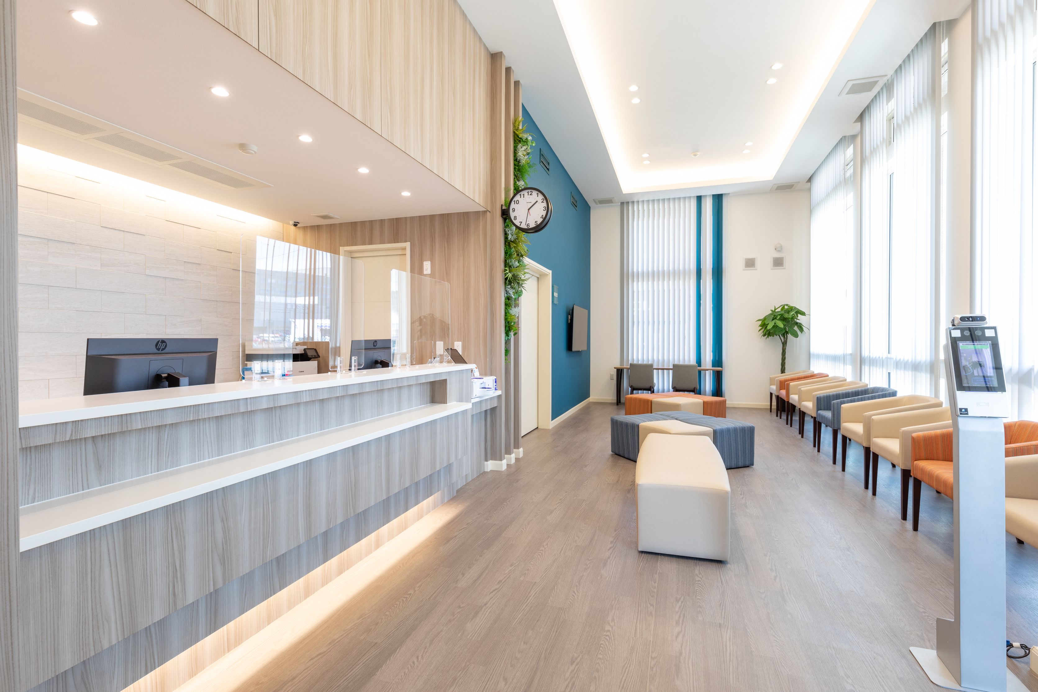 高い天井と大きな窓により圧迫感のない空間になっています。患者様同士の間隔を保つため独立した椅子を配置しています。